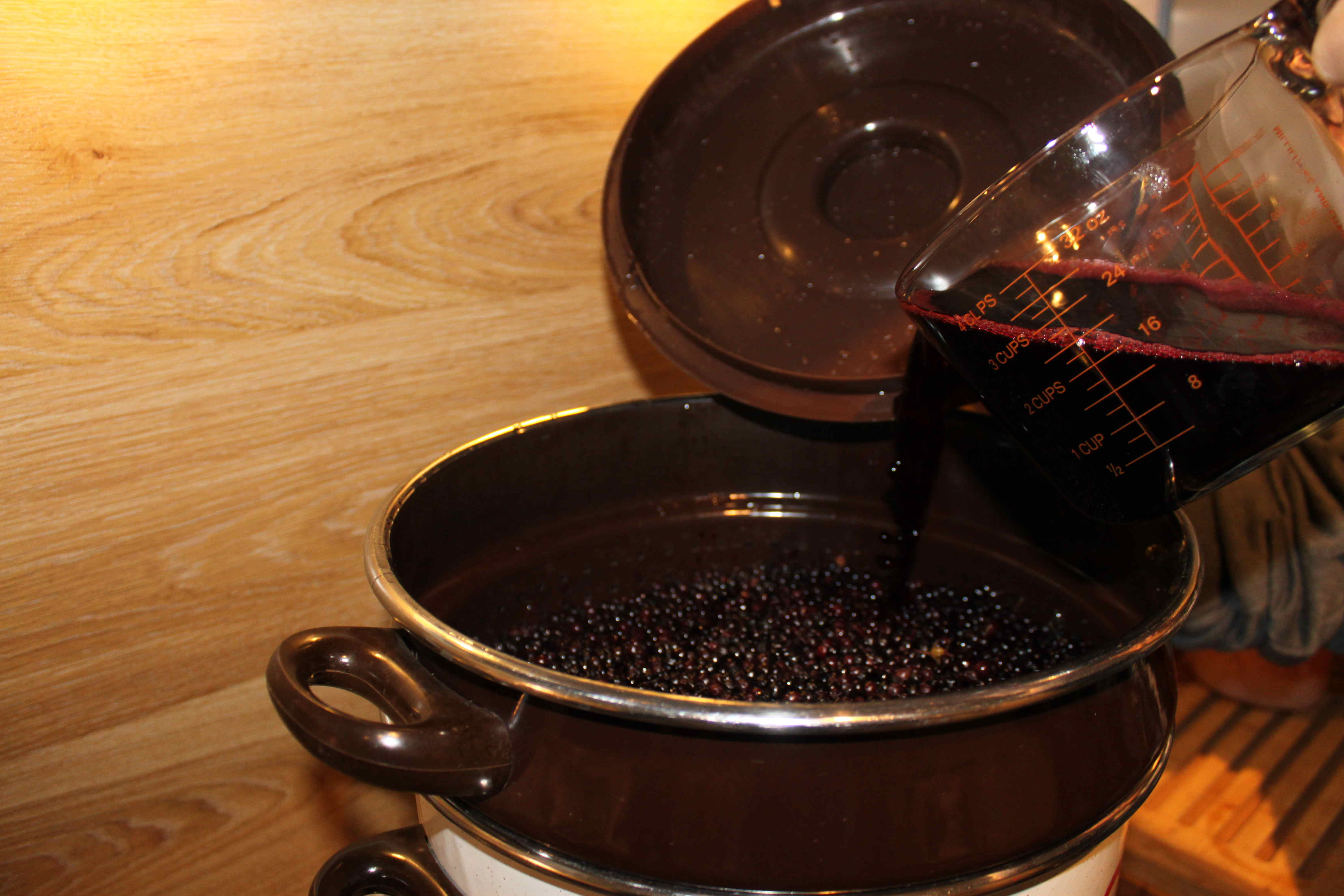 - Nachdem der erste Saft entstanden ist, füllen wir diesen in einen Messbecher, öffnen den Deckel des Entsafters und gießen diesen oben über die Holunderbeeren wieder in das System. Dadurch wird der Zucker, der sich zwischen den Lagen befindet, besser gelöst und die Holunderbeeren werden besser entsaftet. Diesen Prozess wiederholen wir nach jeweils ca. 10 Minuten noch zweimal.