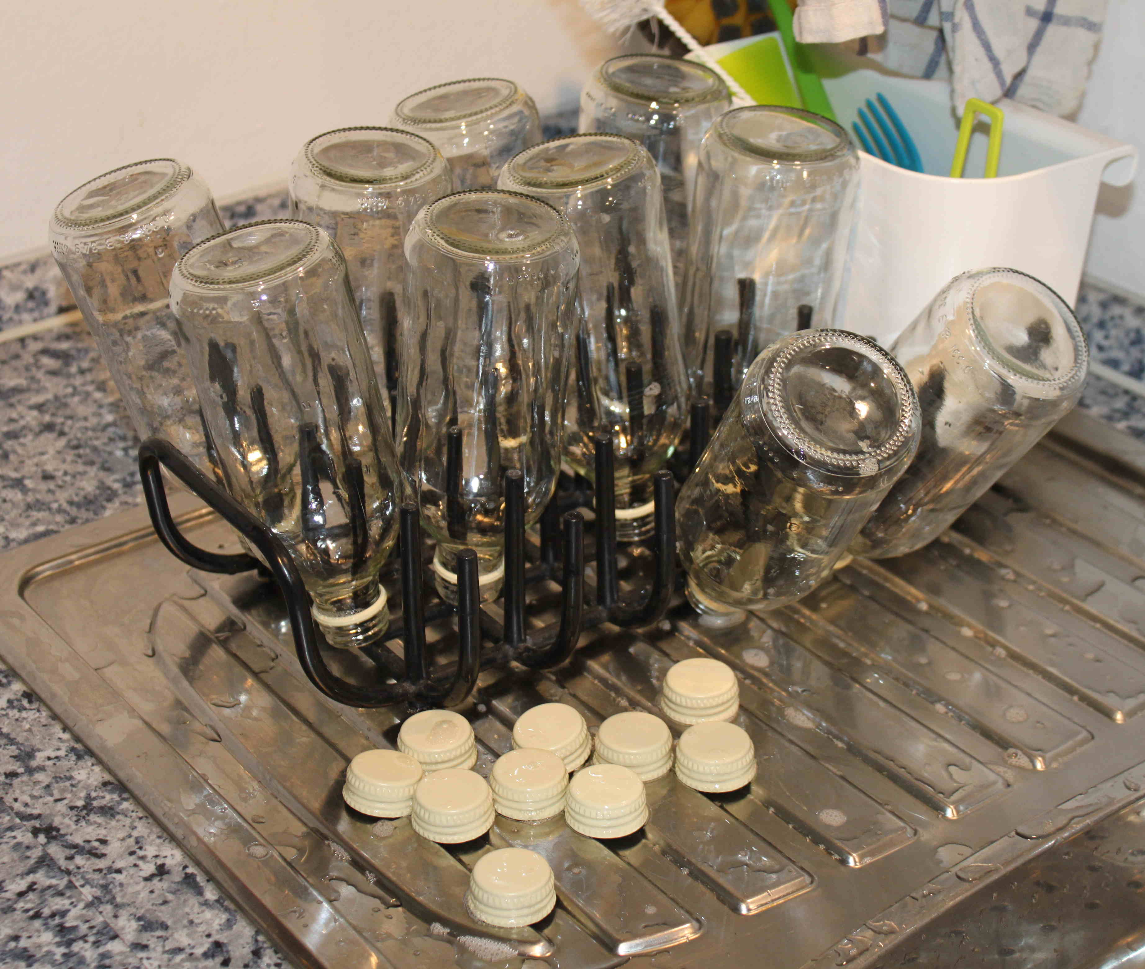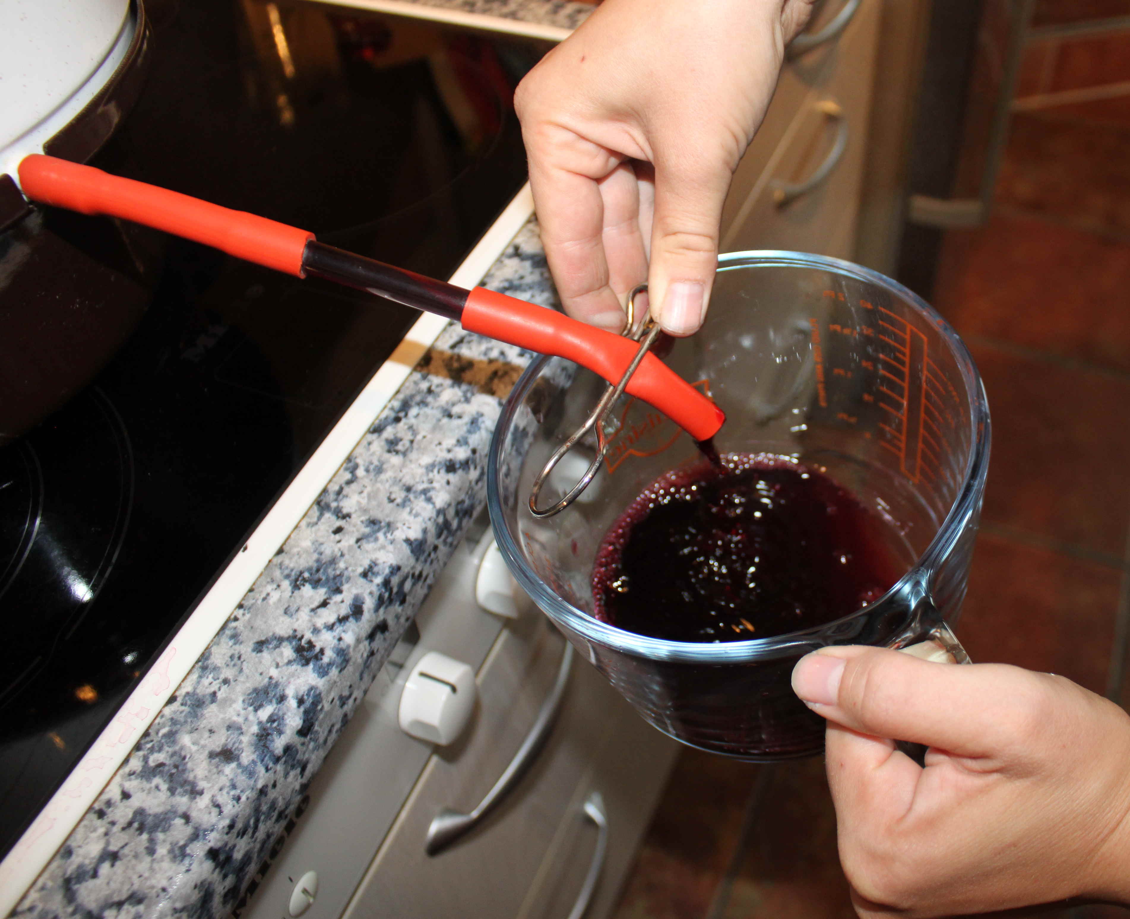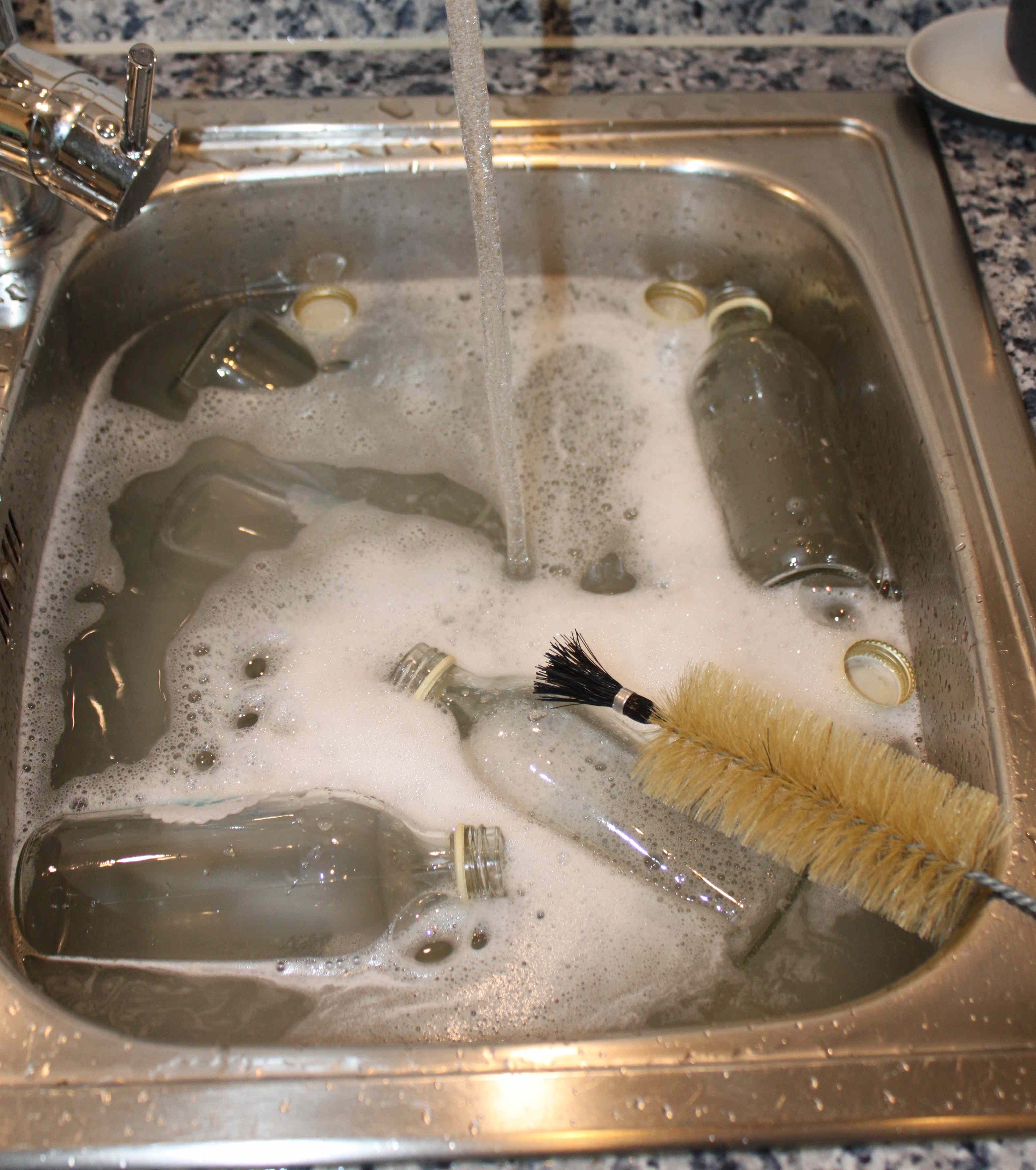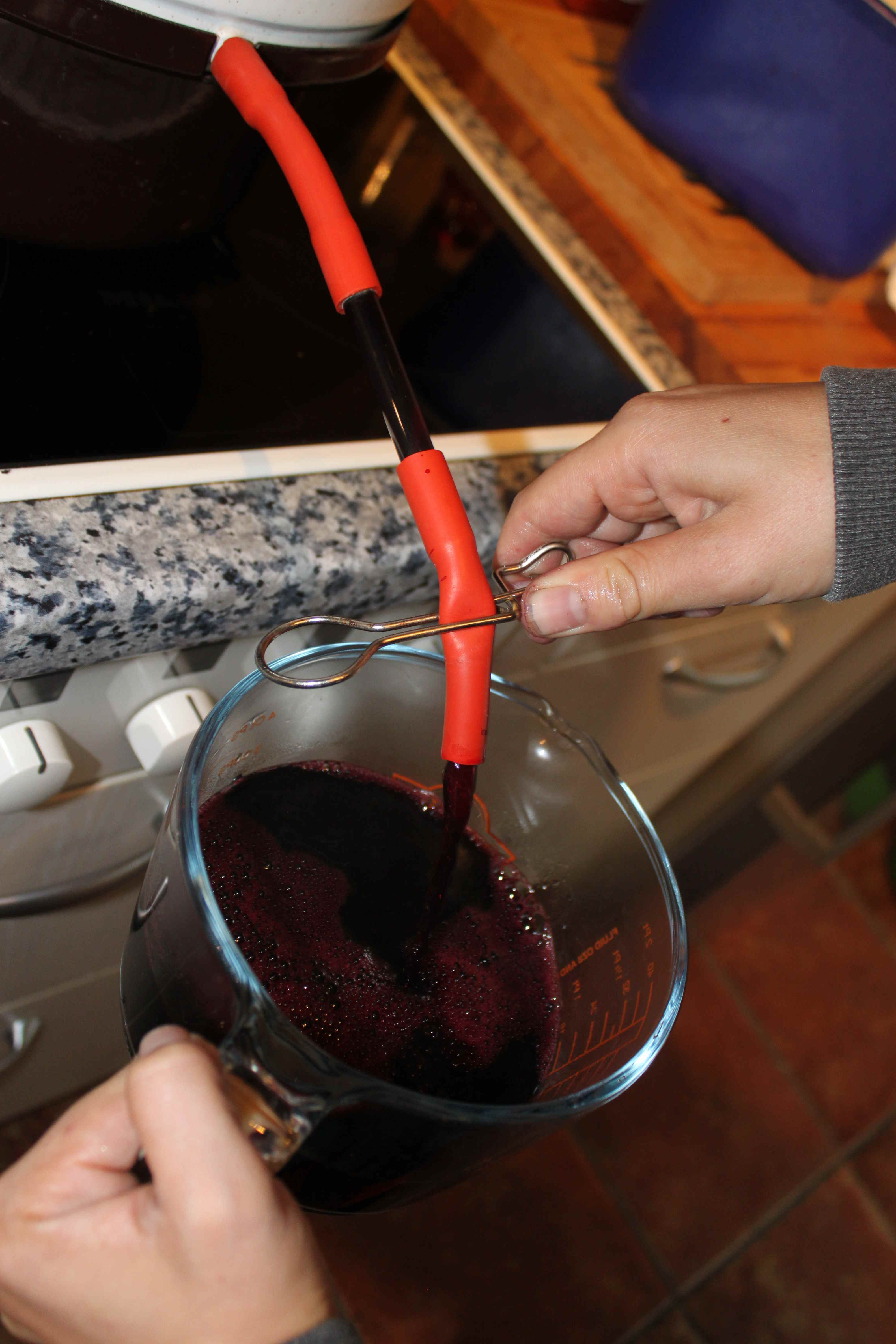 - Kurz vor dem Abfüllen legt man die ersten Flaschen und Deckel am Besten in sehr heißes Wasser. Dies reduziert zum einen die mögliche Kontamination mit Keimen, die den Inhalt schimmeln lassen und dient zusätzlich dazu die Flaschen vorzuwärmen, damit sie beim Befüllen, mit dem heißen Saft, nicht platzen.