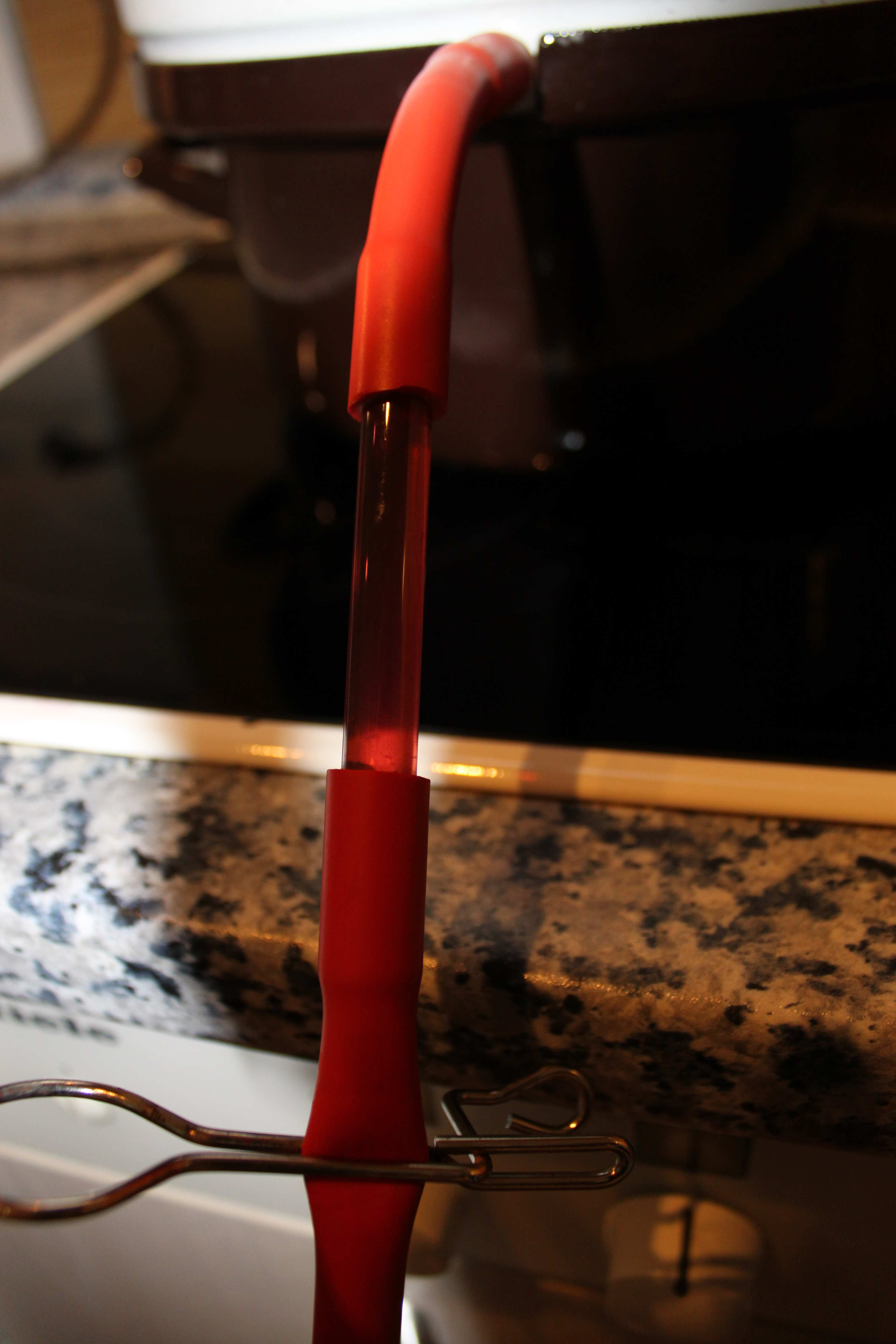 - Nach ca. 20 Minuten bildet sich der erste Saft und fließt in das Abfüllröhrchen. Dieses Röhrchen besteht (in unserem Modell), neben einem Gummischlauch, auch zum Teil aus einen Glasschlauch, wodurch man leicht erkennen kann, dass Saft entstanden ist.