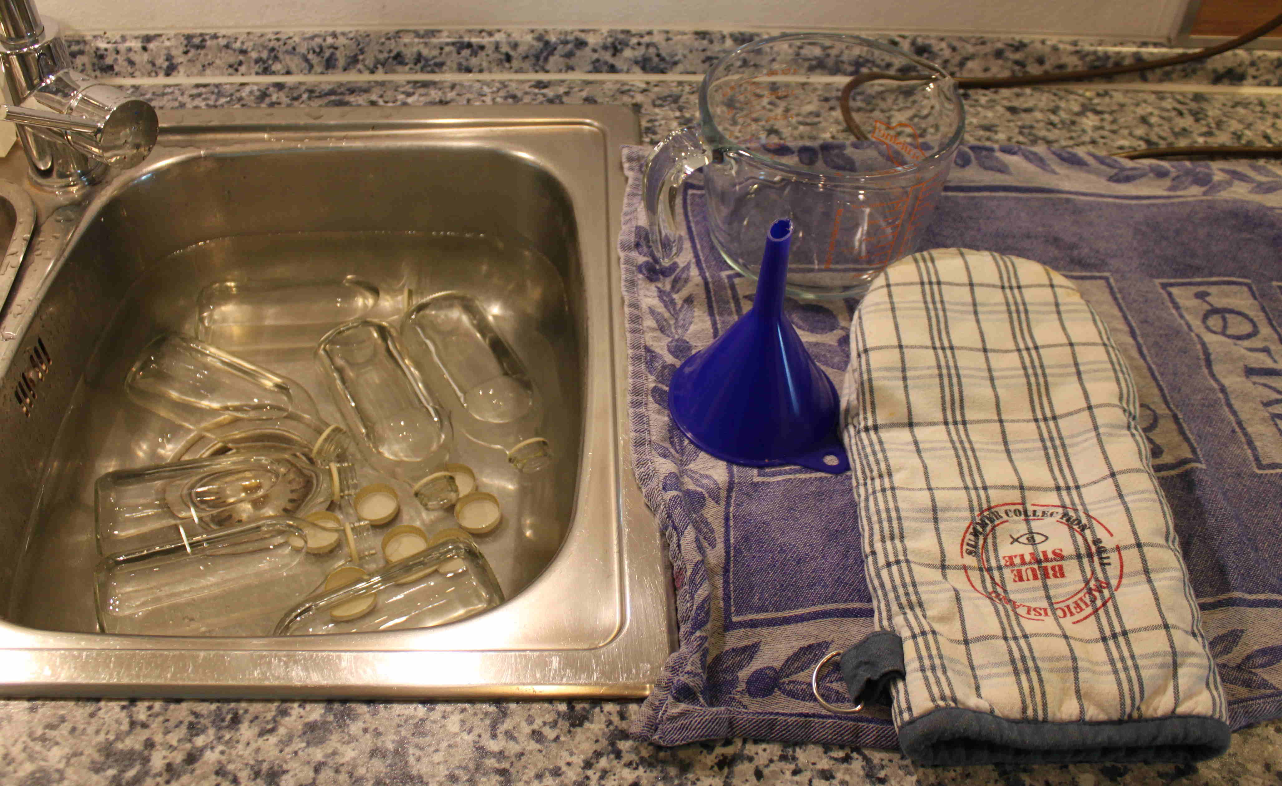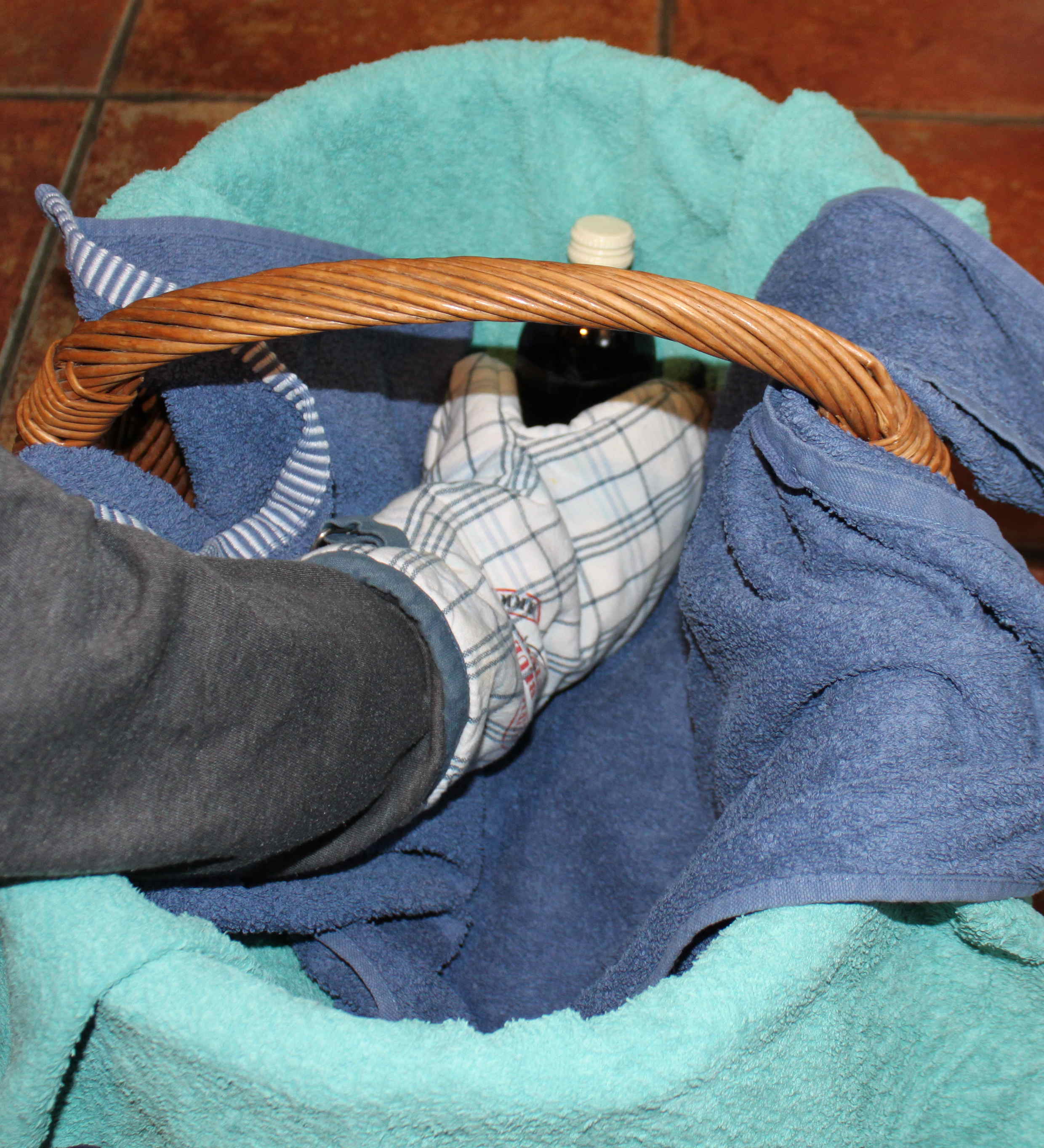 - Zusätzlich ist es für den späteren Abkühlungsprozess der Flaschen von Vorteil einen Korb und ein paar alte Handtücher bereit zu halten, um die abgefüllten Flaschen später eindecken zu können.