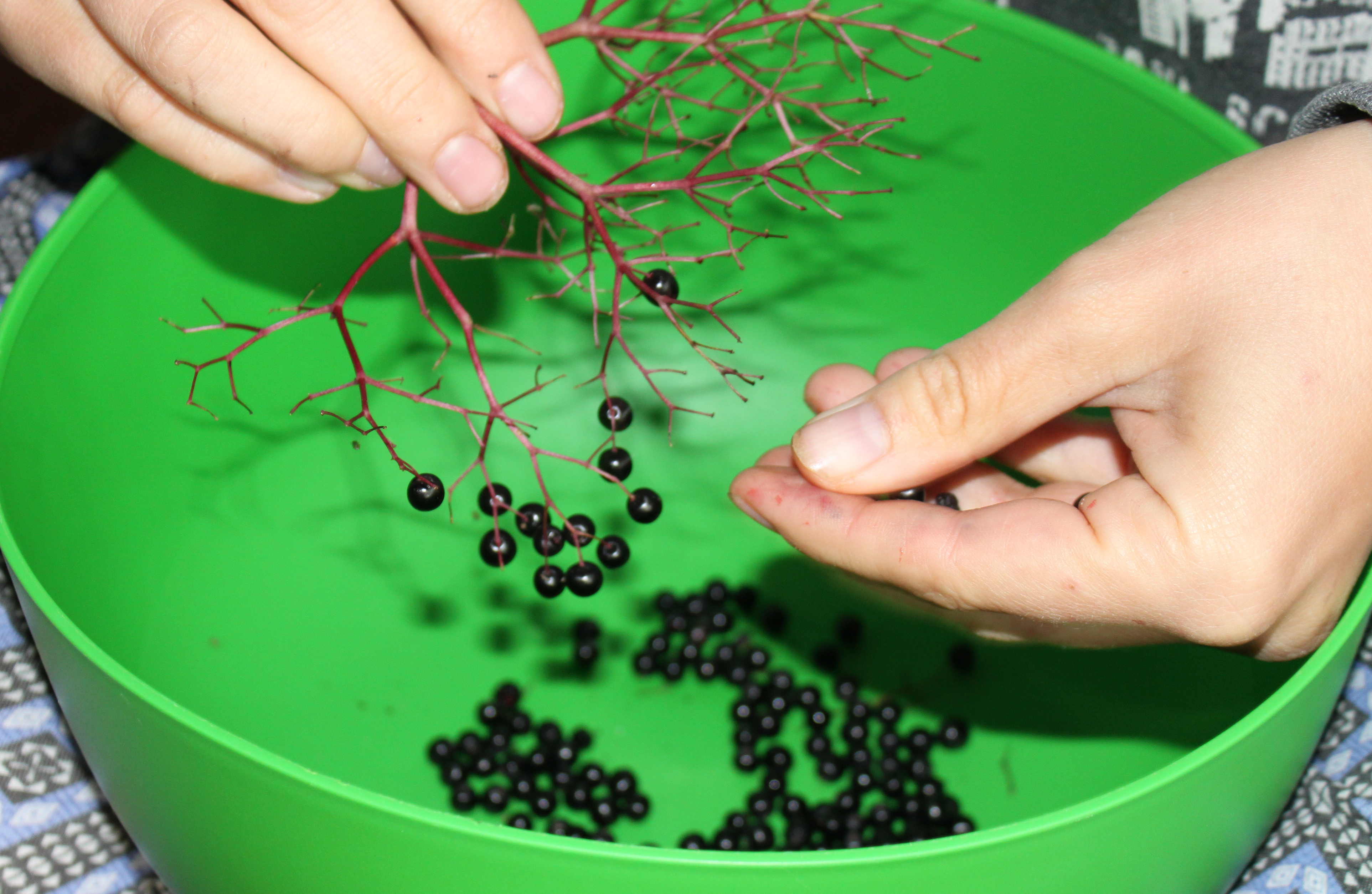 - Nachdem man die Holunderbeeren gesammelt hat, sollte man sich zu Hause ein gemütliches Plätzchen suchen, um die Holunderbeeren von ihren Ästchen zu befreien. Am besten nimmt man eine zweite Schüssel zur Hand und streift die Beeren von ihren Ästchen in die Schüssel ab. Zieht bei diesem Vorgang wie auch schon beim Pflücken am besten alte Kleidung an, da Holunder die Kleidung violett färbt, wenn er mit dieser in Berührung kommt.