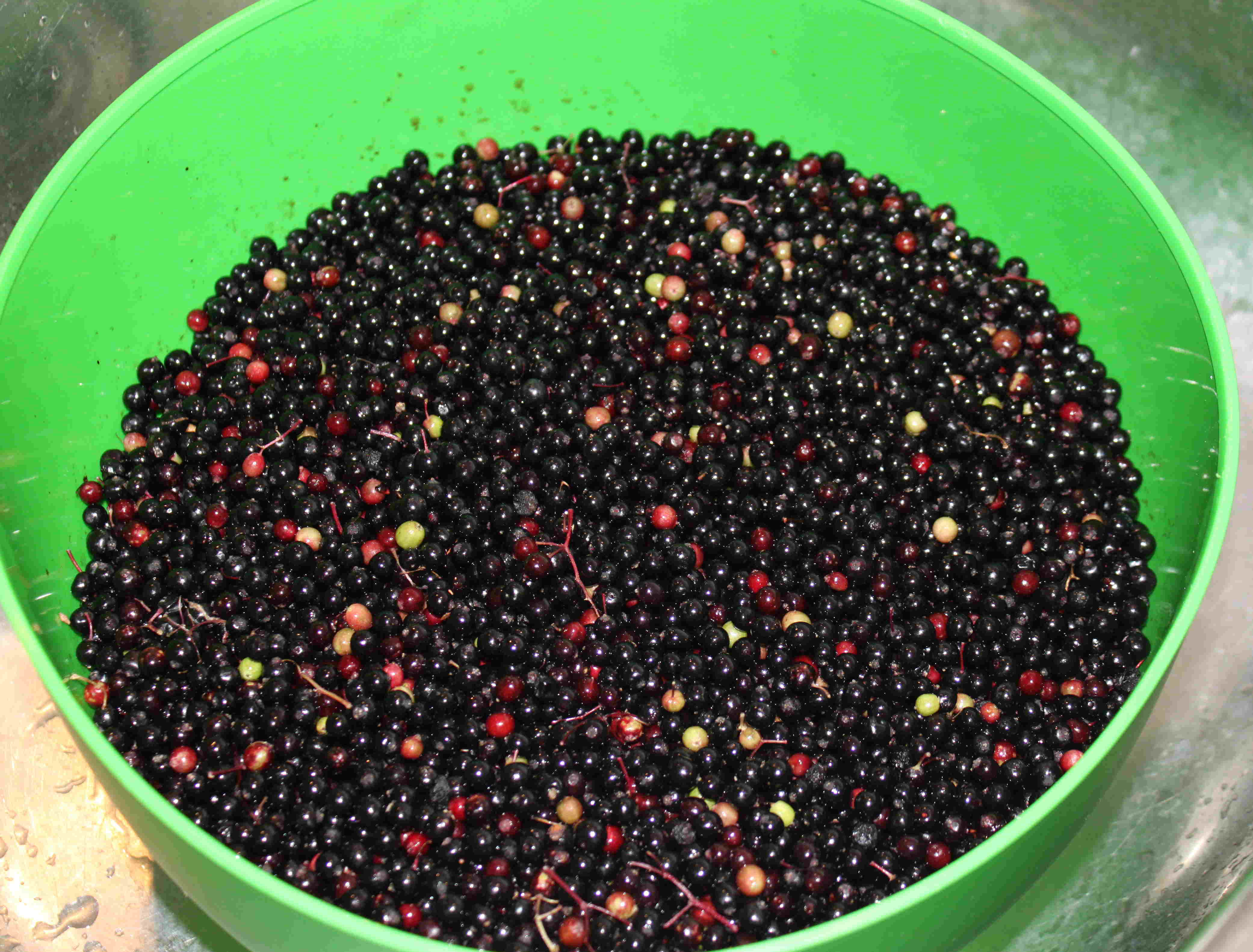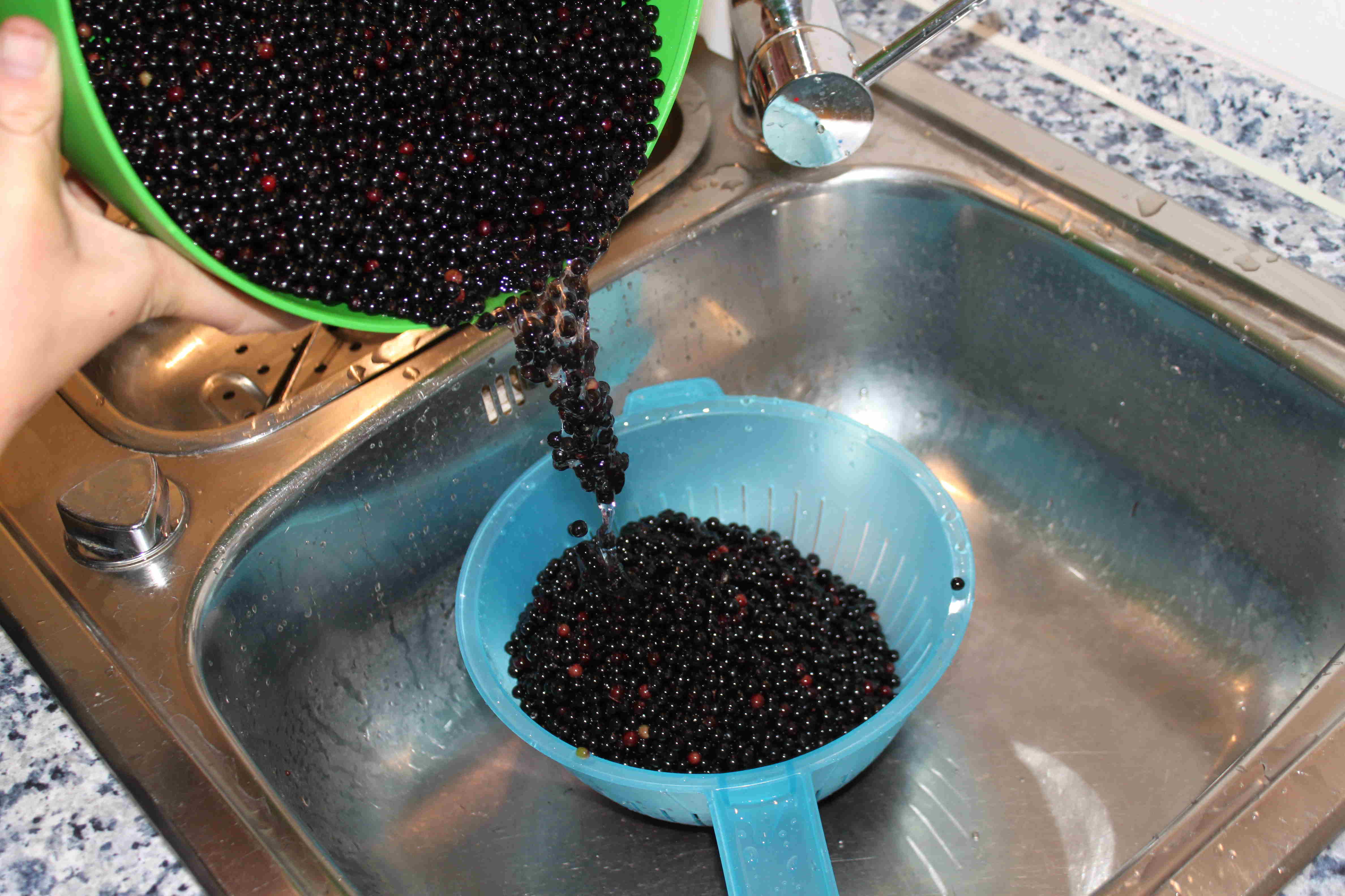 - Hat man alle Beeren abgestreift, wäscht man diese. Der große Vorteil dieser Methode ist, dass wenn man die Schüssel in der die Holunderbeeren sind, zum Waschen unter Wasser setzt, die vertrockneteten, unreifen Beeren, Blätter etc. oben aufschwimmen und man diese leicht abschöpfen kann. Man sollte beim Waschen mehrmals mit der Hand durch die Beeren gehen, damit die Auszulesenden, die sich weiter unten befinden, eine Chance haben aufzuschwimmen.