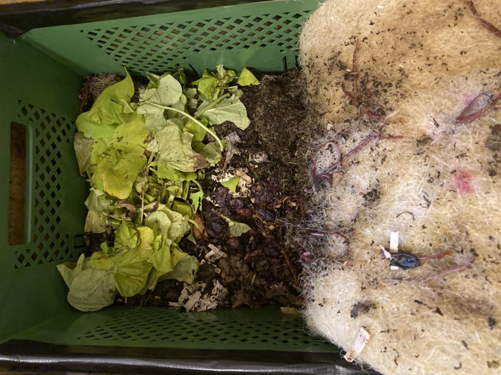 Natürlich wurden unsere Würmer auch nicht vernachlässigt. Um den Kreislauf wieder zu schließen, bekamen sowohl diese als auch der Bokashi einen Teil der Ernte, in Form der langsam verwelkenden Blätter ab.