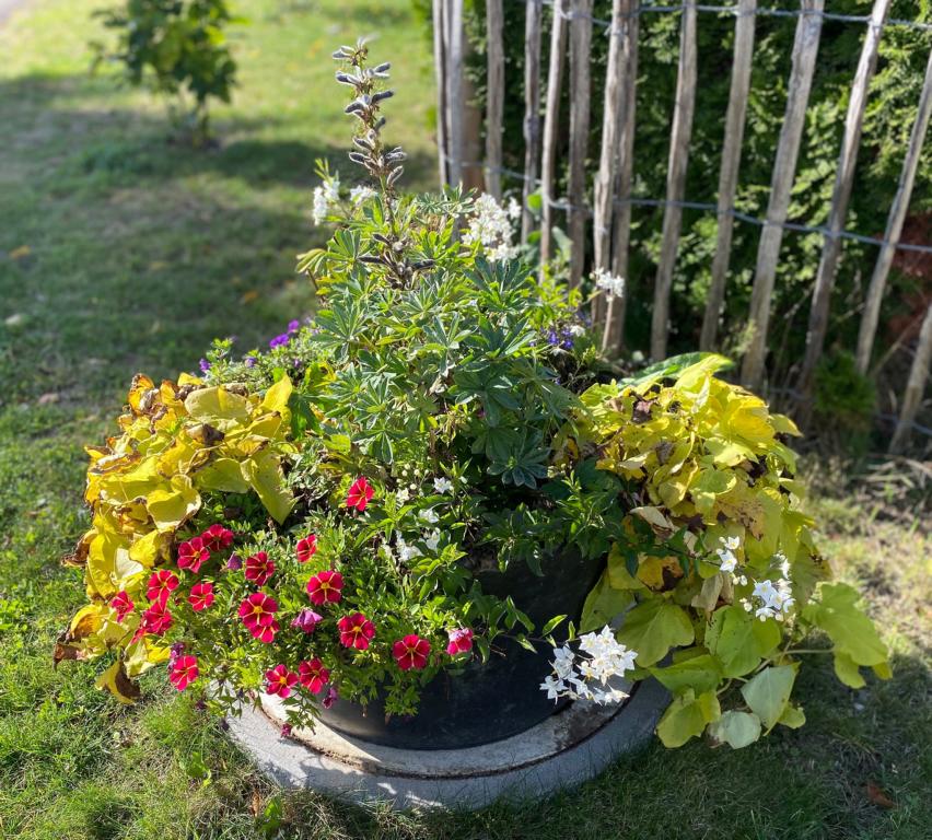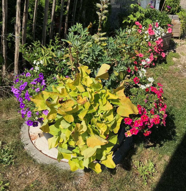 Im Mai 2019 stand ich vor der großen Frage, was ich in den großen Trog, der den Gullideckel in unserem Vorgarten verdeckt, pflanzen soll. Es war klar, dass ich vor allem blühende, hängende Pflanzen pflanzen würde. Zwischen den Blühpflanzen sollte es aber auch etwas grünes „Laub“ geben. Ursprünglich hatte ich an Lakritzkraut gedacht. Dieses hatte die Gärtnerei in unserer Nähe leider nicht, weshalb mir die Gärtnerin riet doch Süßkartoffeln zu setzen, da diese ebenfalls sehr schönes Laub besitzen. Damals dachte ich aus irgendeinem Grund gar nicht darüber nach, dass diese Pflanze auch essbare Knollen hat, die momentan einen ziemlichen Hype in Deutschland erleben, in Form von Pommes etc..