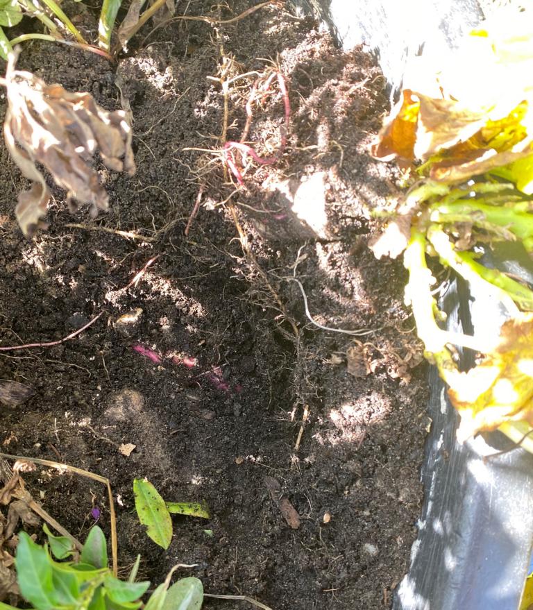 Ehrlich gesagt war ich etwas skeptisch, ob sich überhaupt Süßkartoffeln gebildet haben. Zuerst habe ich das Grün der Pflanze entfernt und dabei einen Teil der Wurzeln rausgerissen.
