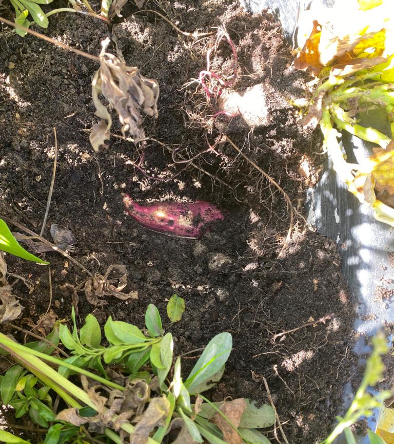Die Enttäuschung war sehr groß, denn weit und breit war keine Süßkartoffel zu sehen. Nachdem ich ein bisschen tiefer Richtung Boden gegraben hatte, traf ich auf etwas Hartes. Einen Stein. Mir war schon zum Aufgeben zumute, als ich beim Graben nochmal auf etwas Hartes stieß. Beim genauen Hinsehen konnte ich die rötliche Haut der Süßkartoffel erahnen.