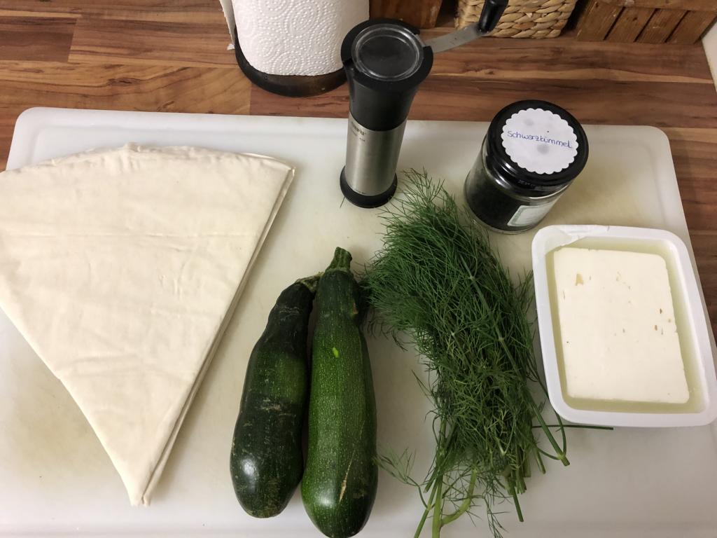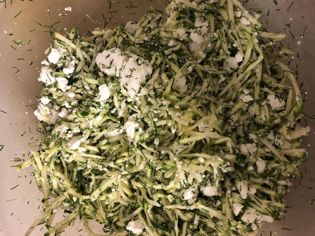 Füllung aus Zuchini, Schafskäse, Dill und Gewürzen.