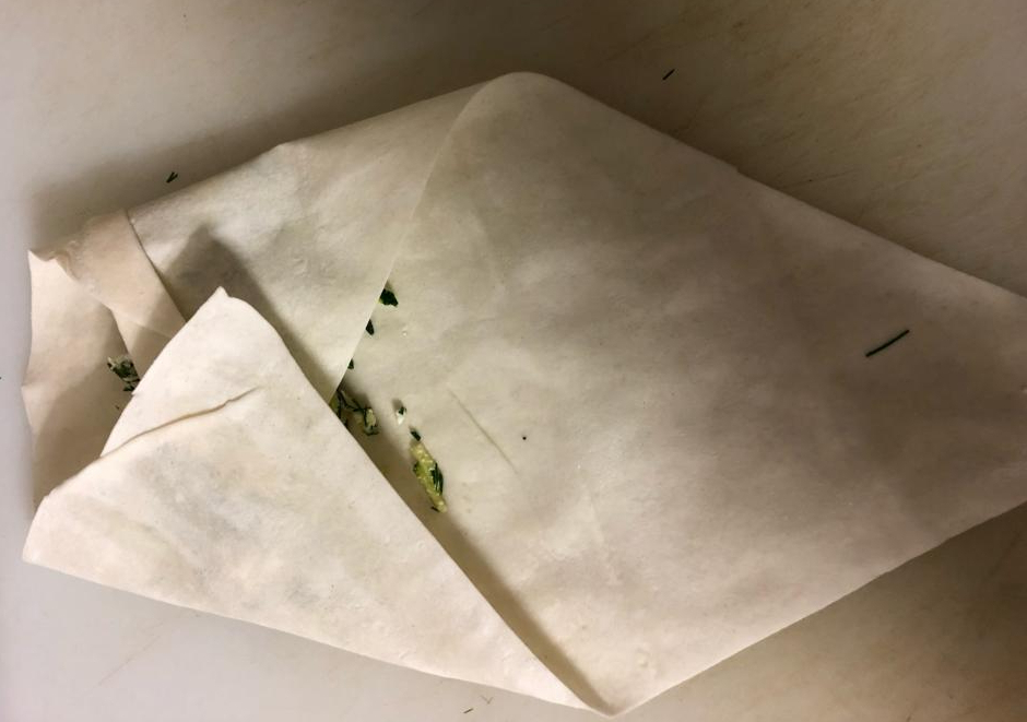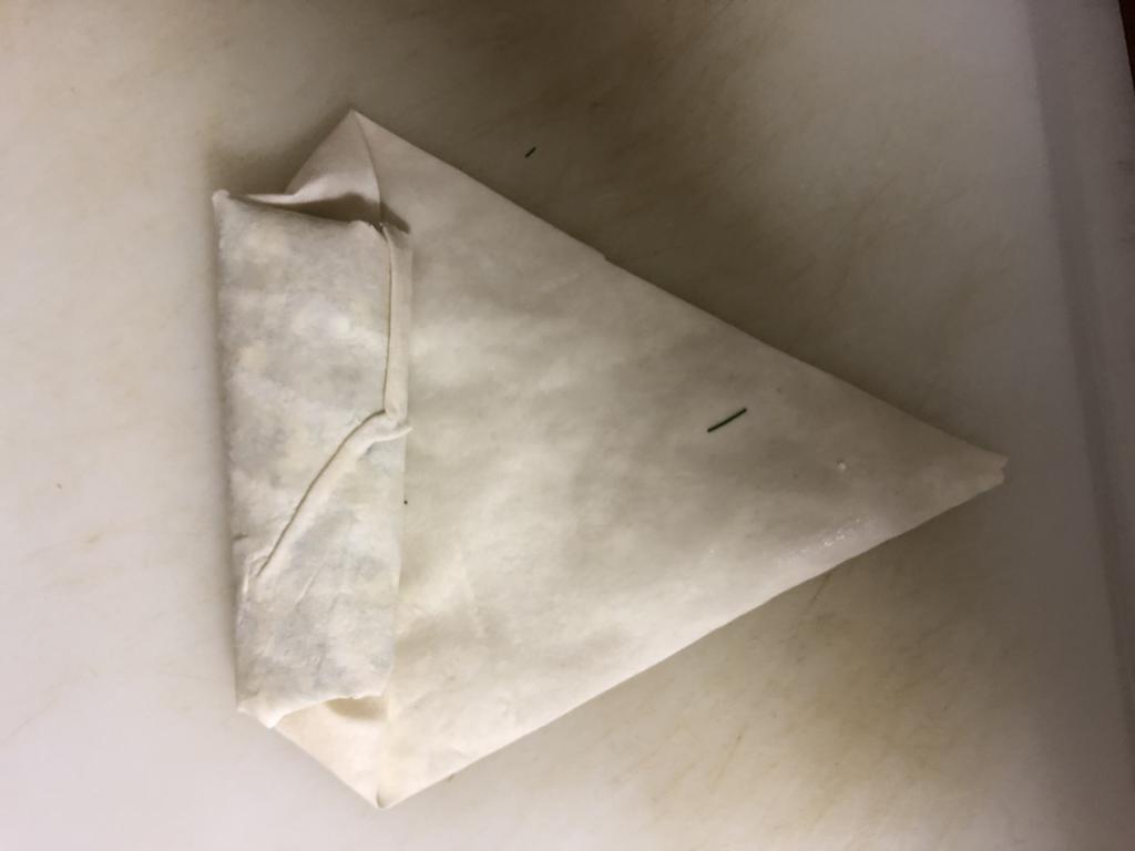 Dann werden zunächst die beiden Dreieckseiten über der Füllung zusammengeklappt und anschließend der obere Rand hinuntergeklappt. Jetzt das ganze herunterrollen bis der untere Zipfel des Teigs erreicht ist. Damit die Röllchen besser halten, die Schnittkanten noch einmal mit Wasser bepinseln.