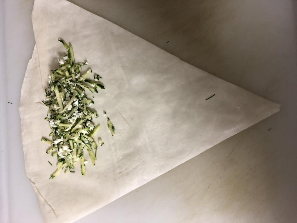 Die Börekteigblätter einzeln aus der Folie nehmen und mit etwas Wasser bepinseln. Das geht am besten mit einem nassen Backpinsel. Anschließend 1 – 2 Eßl. Zucchinimasse auf den oberen Teil des Dreiecks geben. Dabei einen oberen Rand lassen (s. Bilder).