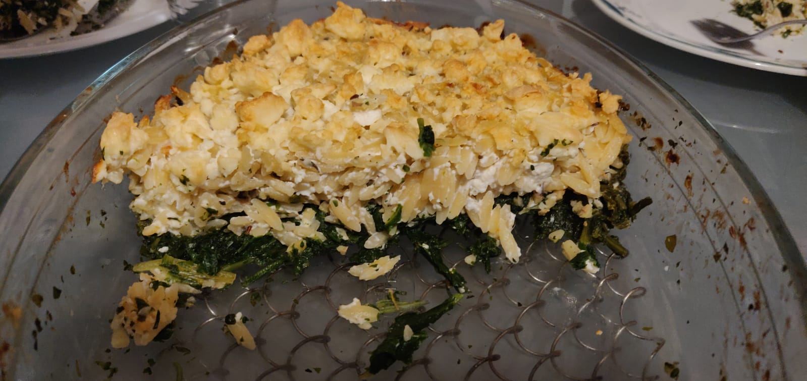 Jetzt die Nudelmasse auf dem Blattspinat verteilen und mit dem restlichen Feta bestreuen. Die Auflaufform nun bei 200°C Ober-/Unterhitze ca. 20 – 30 Minuten backen, bis der Feta goldbraun wird.