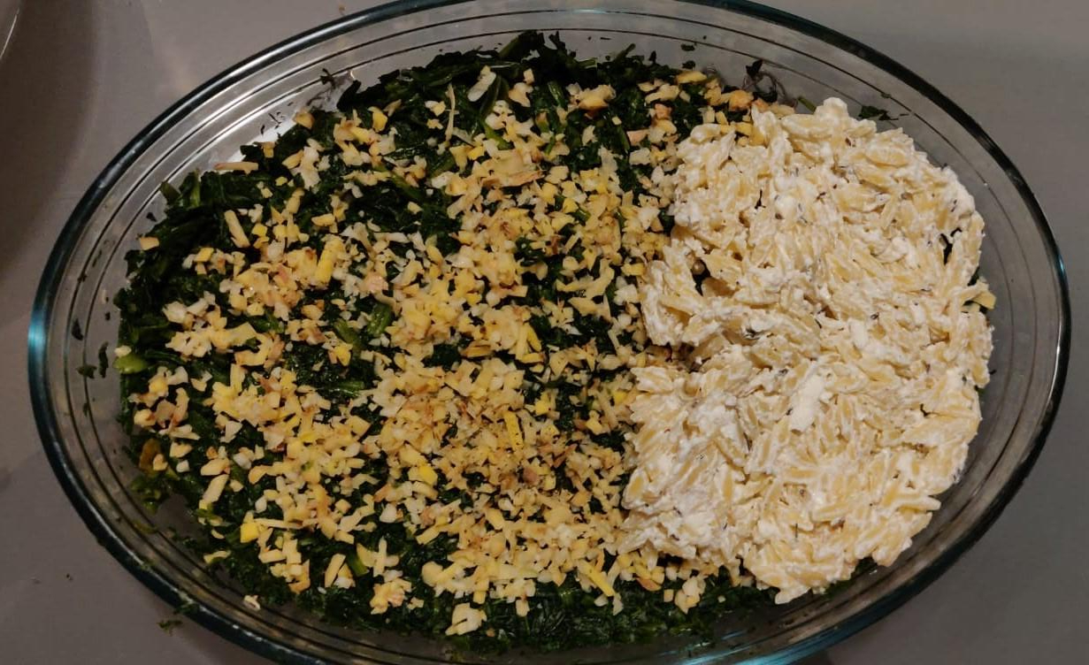 Die mit der Ziegen-Feta-Creme überzogenen Nudeln auf den Blattspinat schichten.