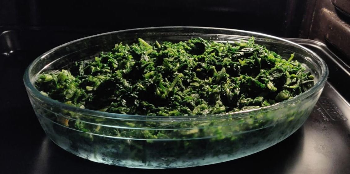 Den Blattspinat auftauen lassen. Bei wem es wie bei mir schnell gehen muss den Spinat bei ca. 50°C Umluft in eine Ofenform geben und tauen lassen. Dafür einfach einen Holzlöffel in die Ofentür klemmen, damit die Feuchtigkeit entweichen kann. Anschließend den Spinat ausdrücken und die Flüssigkeit abgießen.