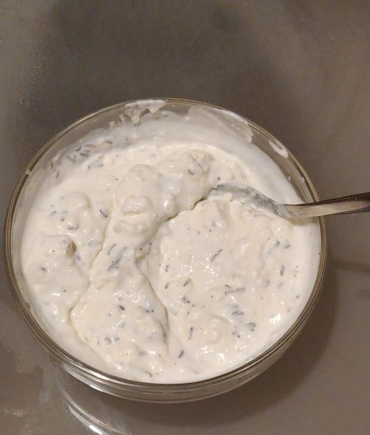 Creme aus Gewürzen, Feta und Schafskäse herstellen und unter die gekochten Nudeln ziehen.