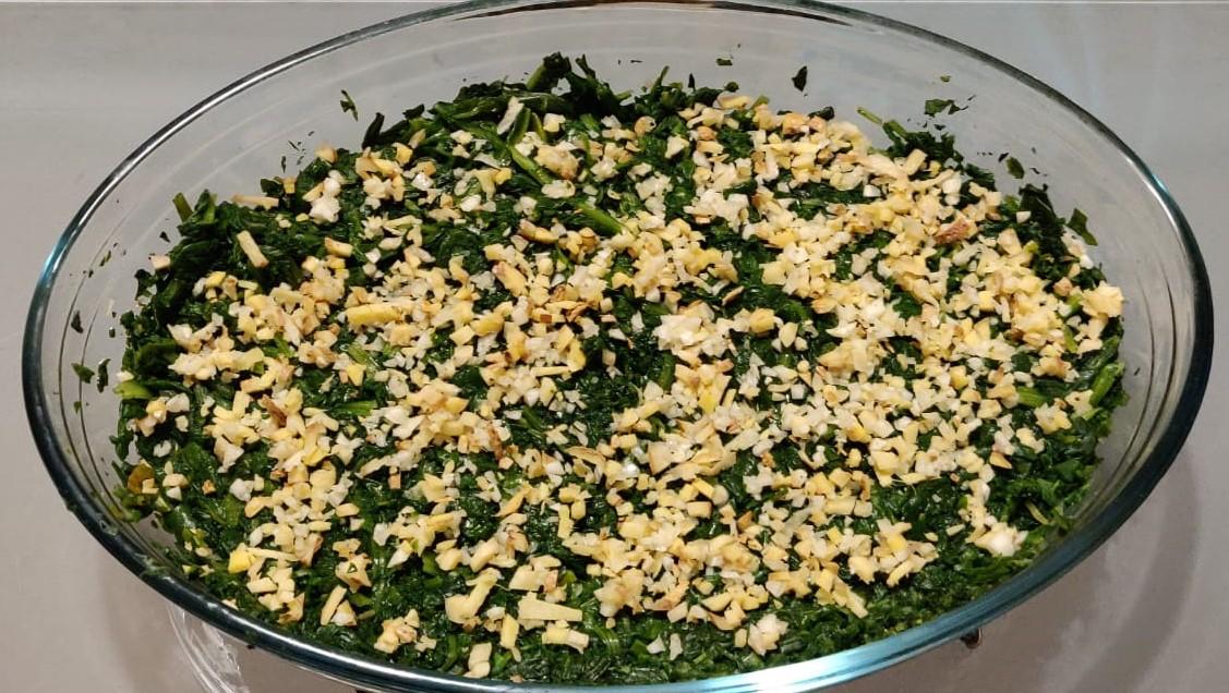 Kleingehackten Knoblauch und Ingwer auf dem Spinat verteilen.