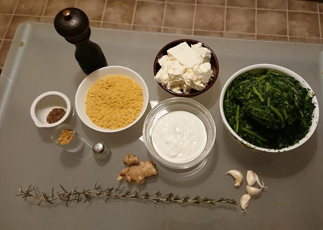 Die Knoblauchzehen und den Ingwer in sehr feine Stücke hacken und auf dem aufgetauten Spinat in der Auflaufform verteilen. Anschließend den Rosmarin zusammen mit dem Kümmel, am besten in einem Mörser zerkleinern. Die Gewürze mit dem Ziegenjoghurt, 200g fein gekrümelten Feta, Pfeffer und etwas Salz (Vorsicht Feta enthält meist von Haus aus viel Salz) vermischen. Dieses Gemisch unter die abgetropften heißen Nudeln ziehen.