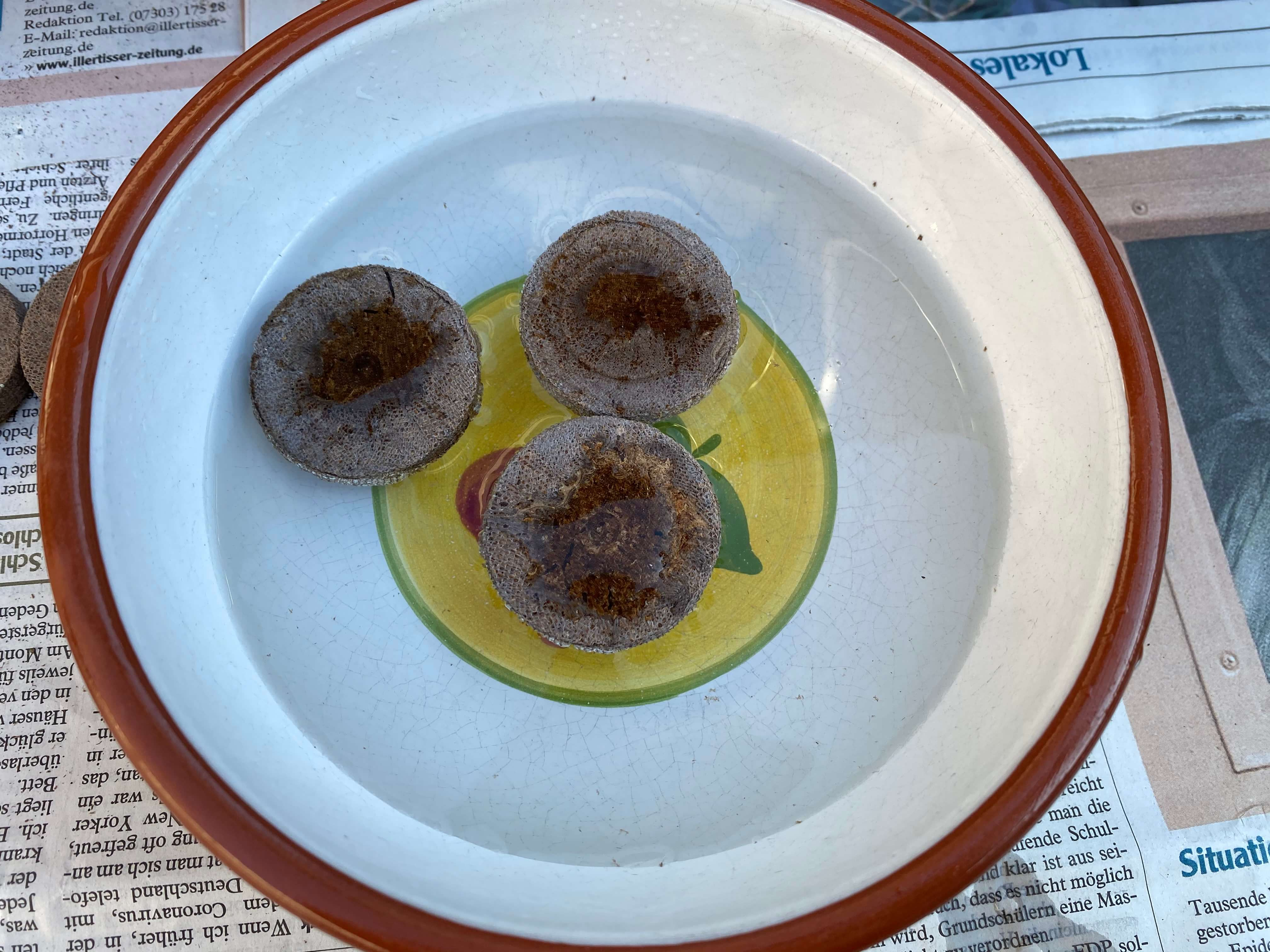Für das kleine Treibhaus mit den Kokosquelltöpfen braucht man lediglich eine Schüssel Wasser. Das Treibhaus sowie die Quelltöpfe erhält man als Set im Handel. Die Quelltöpfe kann man auch einzeln erwerben bzw. nachkaufen. Das Vorgehen zum Aussähen der Pflanzen ist hier denkbar einfach. Man legt die Kokosquelltöpfe in Wasser (für die Ungeduldigen wie mich: mit lauwarmen Wasser geht es etwas schneller) und wartet ab, bis diese sich komplett vollgesogen und ausgedehnt haben. Anschließend legt man die Samen in die vorgegebene kleine Mulde des Substrats. Je nach Samenart, drückt man diese tiefer in das Substrat oder lässt diese (Lichtkeimer) an der Oberfläche liegen. Die kleinen Quelltöpfe mit den Samen werden nun alle in das Treibhaus gesetzt (am besten kurz auf einem Papier notieren, was wo ausgesät wurde). Jetzt kann das Dach aufgelegt werden und das kleine Treibhaus an einen sonnigen Standort z. B. auf die Fensterbank gestellt werden. Nach kürzester Zeit entsteht ein feuchtes Klima durch das Kondensieren des Wassers am Dach des Treibhauses. Generell ist es wichtig nur nach Bedarf zu gießen und das Substrat weder in Wasser zu ertränken noch vertrocknen zu lassen. Bei mir haben sich schon nach ein paar Tagen die ersten Pflänzchen gezeigt. Stoßen die Pflanzen an der Decke des Treibhauses an, müssen diese in Töpfe oder ins Beet umgesetzt werden (s. Beitragsbild). Am besten ist es die Pflanzen an das direkte Sonnenlicht zu gewöhnen, in dem man diese, wenn sie noch etwas kleiner sind, ab und an mal für 30 Minuten ohne Deckel an einem warmen Tag in die Sonne stellt. Wenn man die Pflanzen direkt aus dem Mini-Treibhaus dauerhaft in die Sonne pflanzt, kann es passieren, dass diese verbrennen.