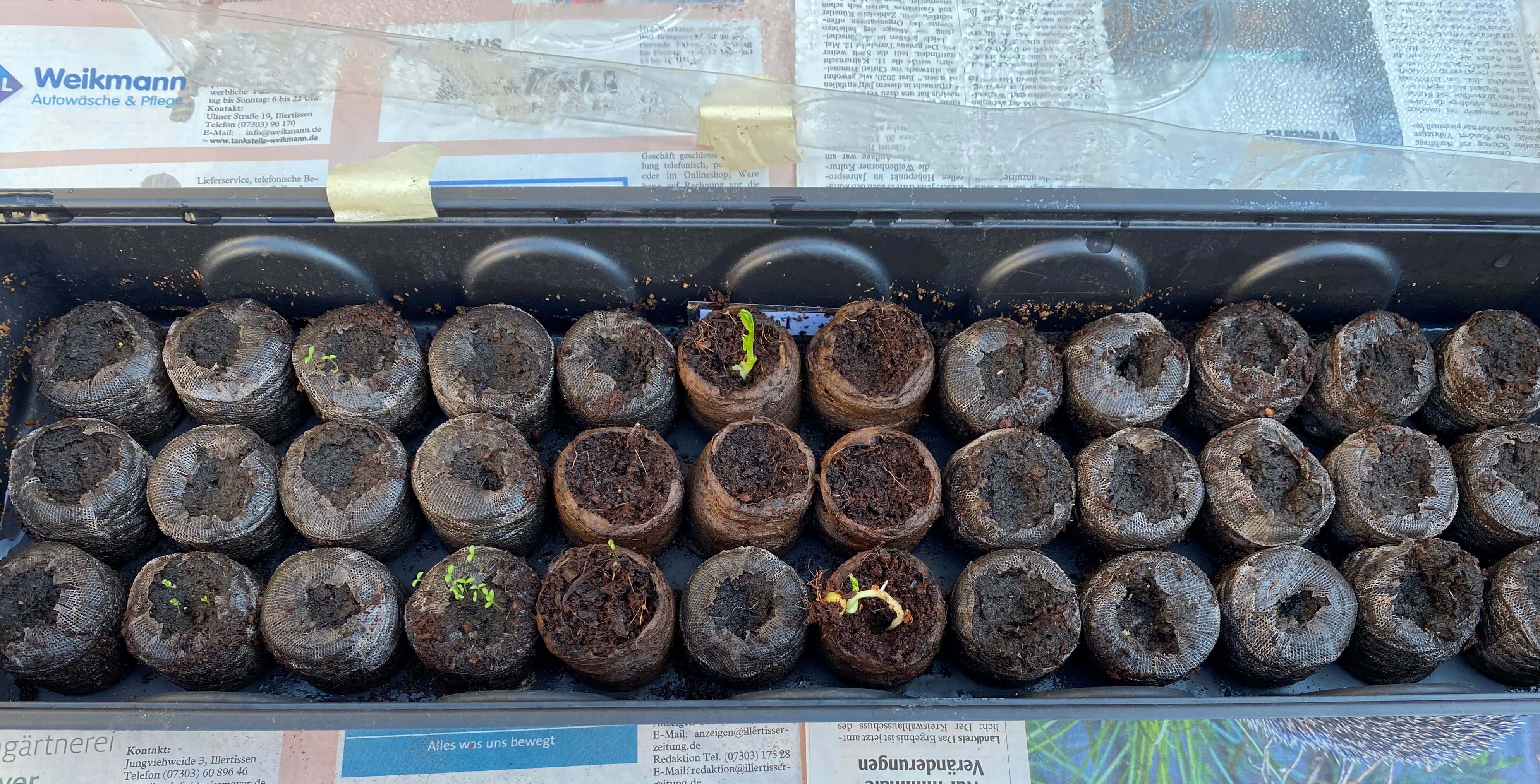 Den Kompost entnehme ich unserer Wurmkiste. Natürlich kann man diesen auch aus einem gewöhnlichen Komposthaufen entnehmen. Die feine, krümelige, sandige Gartenerde erhält man manchmal durch ein paar Mitbewohner im eigenen Garten. Letztes Jahr hatten wir ziemlich viele Maulwurfs- und Wühlmaushügel, was uns alle ziemlich geärgert hat. Ein Bekannter gab uns jedoch den Tipp, die Erde, die durch die Tiere aus den untersten Schichten des Gartens nach oben befördert wird, für die Anzucht zu nutzen. Seitdem tragen wir die Hügel mit Hilfe einer Schaufel ab und freuen uns über unseren fleißigen Maulwurf. Die Erde für das vorzuziehende Gemüse mischt man nun in einem Eimer aus je einem Drittel Kompost, sandiger Gartenerde und alter Blumenerde. Anschließend füllt man die Töpfe oder das Mini-Treibhaus mit der Erde und sät die Samen aus (notiert Euch am besten, was Ihr ausgesät habt). Gießen nicht vergessen! Genauso wie das Treibhaus mit den Kokosquelltabletten brauchen die Töpfe bzw. das Mini-Gewächshaus mit dem eigenen Substrat einen sonnigen, warmen Platz. Nach ein paar Tagen je nach Pflanzenart beginnen die ersten Pflanzen zu keimen. Falls die Pflanzen an das Gewächshausdach stoßen, müssen diese in Töpfe oder das Beet umgesiedelt werden (s. Beitragsbild). Ebenso wie bei dem Treibhaus mit den Kokosquelltabletten muss man die Pflanzen zuerst an das direkte Sonnenlicht gewöhnen, bevor man diese direkt in die Sonne pflanzt, da sie ansonsten eingehen könnten.