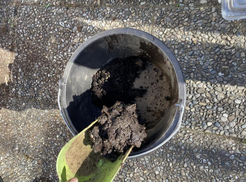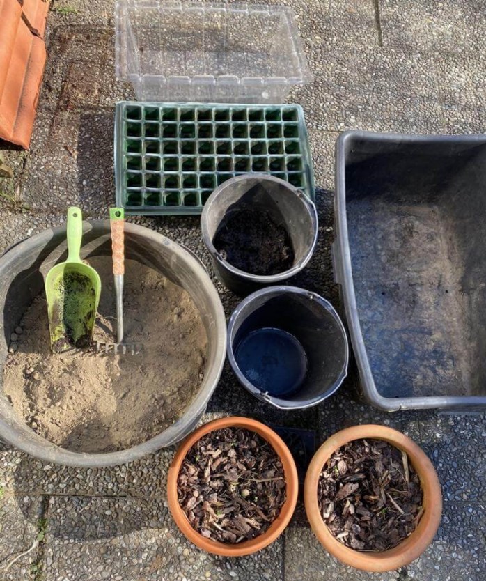 Alternativ kann man auch ein eigenes Substrat zur Anzucht der Pflanzen herstellen. Man benötigt lediglich kleine Töpfe oder ein kleines Vorzuchtsgewächshaus wie im Bild zu sehen. Zum Mischen des Substrat ist ein Eimer hilfreich und evtl. eine kleine Schaufel. Die Erde mische ich aus drei Teilen. Ein Teil Kompost, ein Teil feine, krümelige, sandige Gartenerde und ein Teil alte Blumenerde, die sich noch in den Töpfen vom letzten Jahr befindet. Der Rindenmulch der noch oben auf den Töpfen aufliegt, wird nicht verwendet sondern in einem Eimer auf die Seite gestellt.
