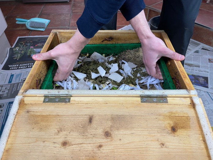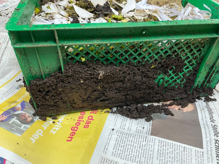 Wir haben im Dezember 2020 festgestellt, dass unsere Futterbox (=die grüne Kiste im Bild) bereits bis zu den Griffen gefüllt ist. Das ist ein klares Signal, dass die Wurmkiste in nächster Zeit geleert werden sollte, da es ansonsten sehr schwierig ist die grüne Kiste zu entnehmen.
