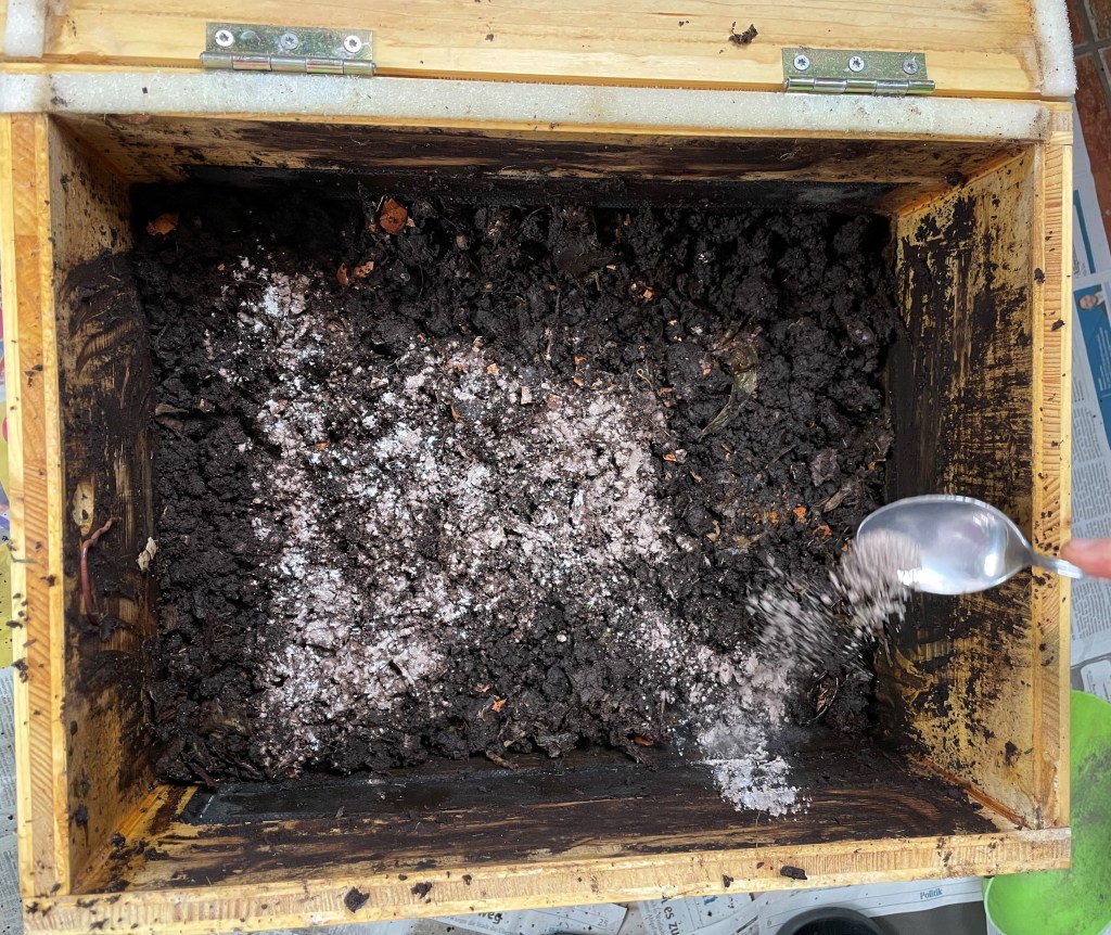 Fünf Tage vor der Eintreibung unserer Miete, haben wir begonnen unsere Mitbewohner in den oberen Stock (Futterbox) zu locken. Das funktioniert am besten mit ca. zwei Esslöffeln Polenta. Diese wird auf die obere Kiste gestreut. Die Würmer mögen Polenta sehr gerne und beginnen aus dem unteren Bereich der Wurmkiste nach oben zu wandern. Sind die fünf Tage vorbei kann man den Wurmhumus ernten, ohne viele Würmer aus diesem entfernen zu müssen.