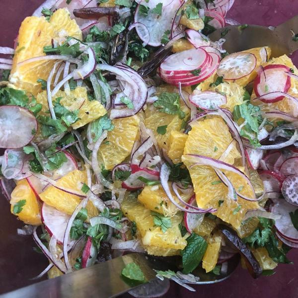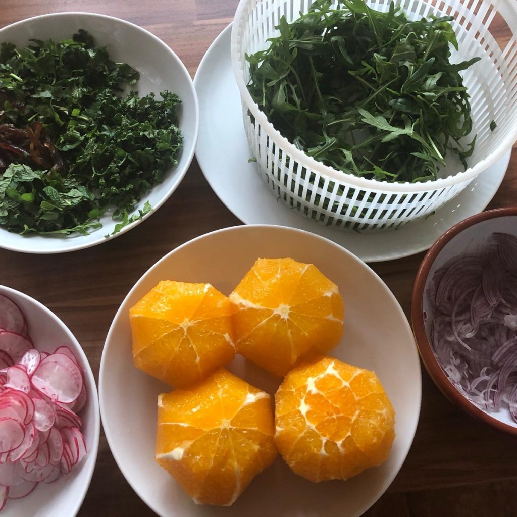 Heute möchte ich Euch einen richtigen Gute-Laune-Salat für kalte, graue Tage vorstellen, den Gnomi letztens zubereitet hat. Das frische Grün der Kräuter in Kombination mit dem Rot der Radieschen und Zwiebeln und dem kräftigen Orange der Apfelsinen sieht gut aus und der Salat schmeckt richtig frisch, knackig und fruchtig. Einen zusätzlichen Kick geben die Gewürze im Dressing.