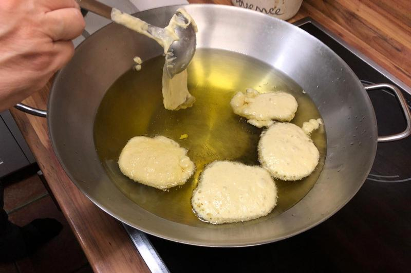 Das mit Rosinen gespickte Hefegepäck wird in Fett ausgebacken und anschließend in 1 EL Zucker gewälzt. Diesen letzten Schritt lasse ich bei der Zubereitung weg, da mir persönlich die „naturellen“ Püfferkes am besten schmecken.